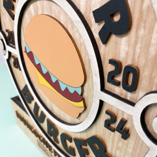 Depuis plusieurs années, Marlène Création collabore avec l’agence événementielle Alliance Expo pour créer des trophées, médailles, et diplômes destinés à leurs événements prestigieux dans le secteur des métiers de bouche. Cette année, à l'occasion du salon de Dijon, Marlène a eu l'opportunité de concevoir un trophée unique pour récompenser le vainqueur du meilleur burger. Baptisé « Le Goût de la Victoire », ce trophée en bois est à la fois coloré, imposant et riche en détails. Retour sur cette création qui célèbre le talent culinaire et l’excellence.
